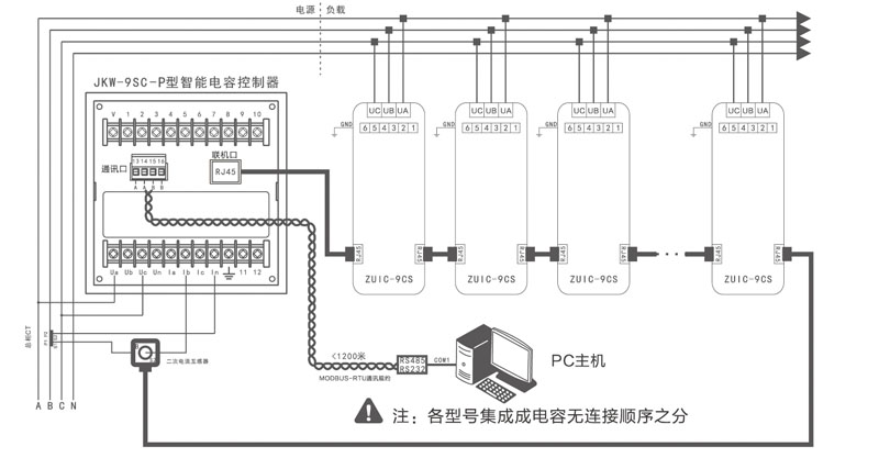JKW-9SC型控制器与ZUIC-9CS或ZUIC-9KS或ZUIC-7CS系列组成三相共补系统典型应用接线图